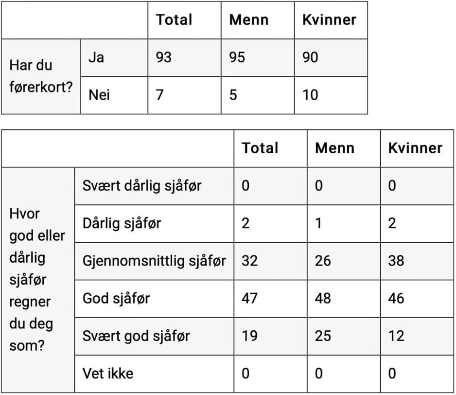 Totalt har 518 menn og 448 kvinner med førerkort svart på spørsmålene under: