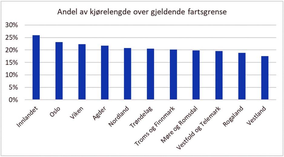 I Innlandet foregår hele 25,9 prosent av kjøringen over fartsgrensen, fulgt av Oslo med 23,2 prosent. I motsatt ende av skalaen finner vi Vestland med 17,6 prosent og Rogaland med 18,8 prosent.