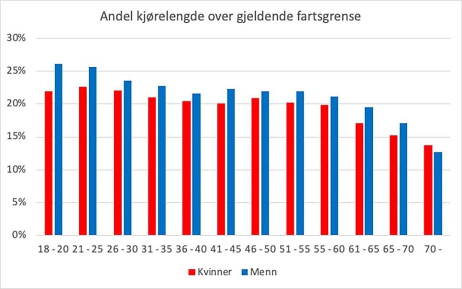 I aldersgruppen 18 – 25 år er det slik at for hver kilometer (1000 meter) som kjøres så brytes fartsgrensen i 240 meter av dem, uavhengig av hva fartsgrensen er der de kjører. De ulike gruppene i aldersspennet mellom 26 – 60 år bryter alle fartsgrensen i mer enn 200 av 1000 meter, og det er først når alderen passerer 60 at trykket på gasspedalen letter.