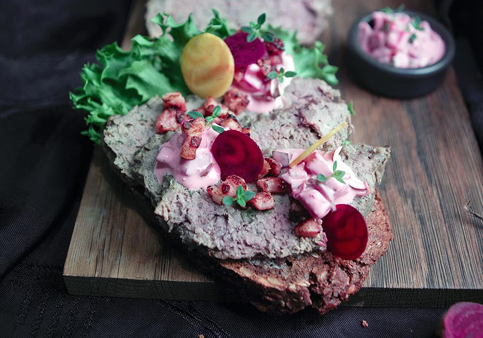 Grovt rugbrød med hjemmelaget leverpostei er en sandwich som passer til lunsj, i matpakken og til jul. Server med rødbetsalat og bacon. Se bildet over.