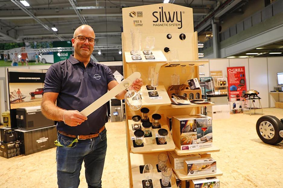Helt magnetisk: – Sjekk ut denne! Kennet Meyer fra Max Fritid viser stolt frem en av tilbehørsleverandørens nyheter på messen. Glassene fra Silwy sitter fast med magnet og en metallskinne, og kan til og med festes opp ned. Glassene fås ikke bare i uknuselig plast, men også i krystall.