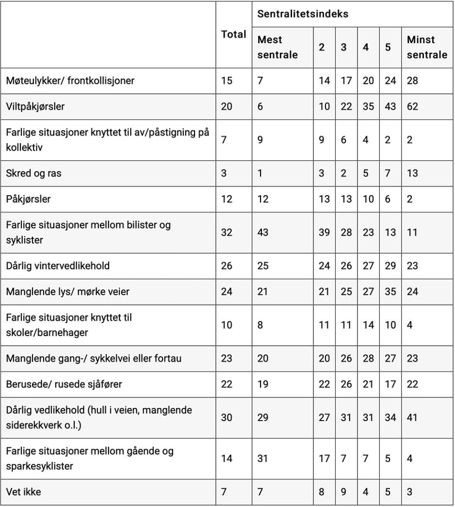 På landsbasis oppgir 20 prosent at de er bekymret for å møte vilt. Men i de mest spredtbygde områdene i landet er det hele 62 prosent som oppgir at de er bekymret for å møte på vilt langs veiene. Jo mindre sentralt folk bor, jo høyere er bekymringen, viser NAFs Trafikantbarometer 2021.