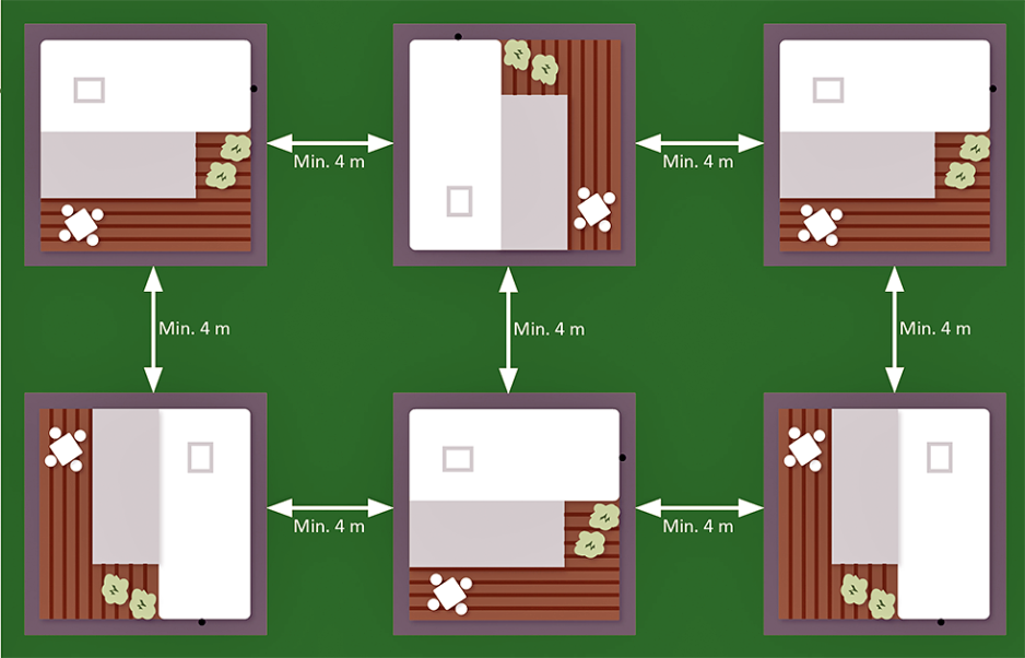 Det innføres en avstandsbestemmelse på fire meter. Dette er helt uavhengig av hva som inngår i den enkelte campingenheten. Avstanden på 4 meter skal måles fra ytterpunkt til ytterpunkt på campingenhetene. Her har de gamle reglene vært tolket ulikt. Det har tidligere vært tvil om hva som er det ytterste punktet på den enkelte campingenheten. Nå er reglene langt klarere på dette punktet.