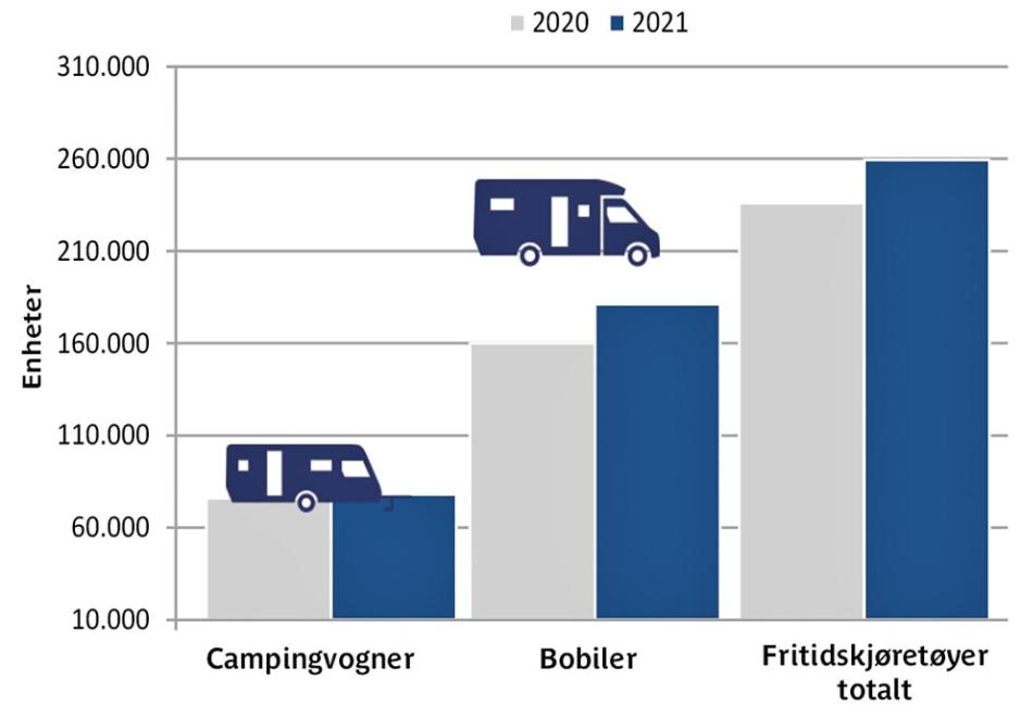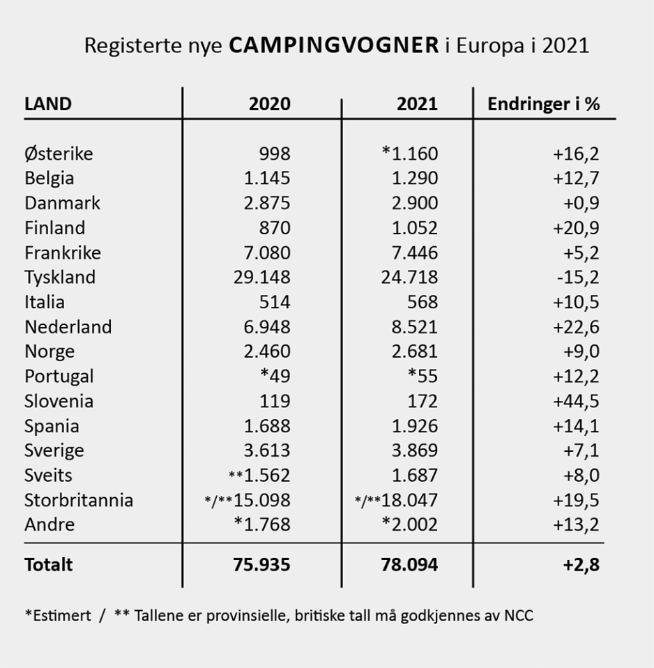 Mens hele Europa har hatt en betydelig økning i nysalget av bobiler gikk det ned i Norge i 2021. Det er det ingen som helt kan forklare. Men, tar vi med salget av nye vogner i Norge, så går fjorårssalget av fritidskjøretøy nesten i null, sammenlignet med 2020. Slik ser tallene (nyregistreringer) for hele Europa ut: