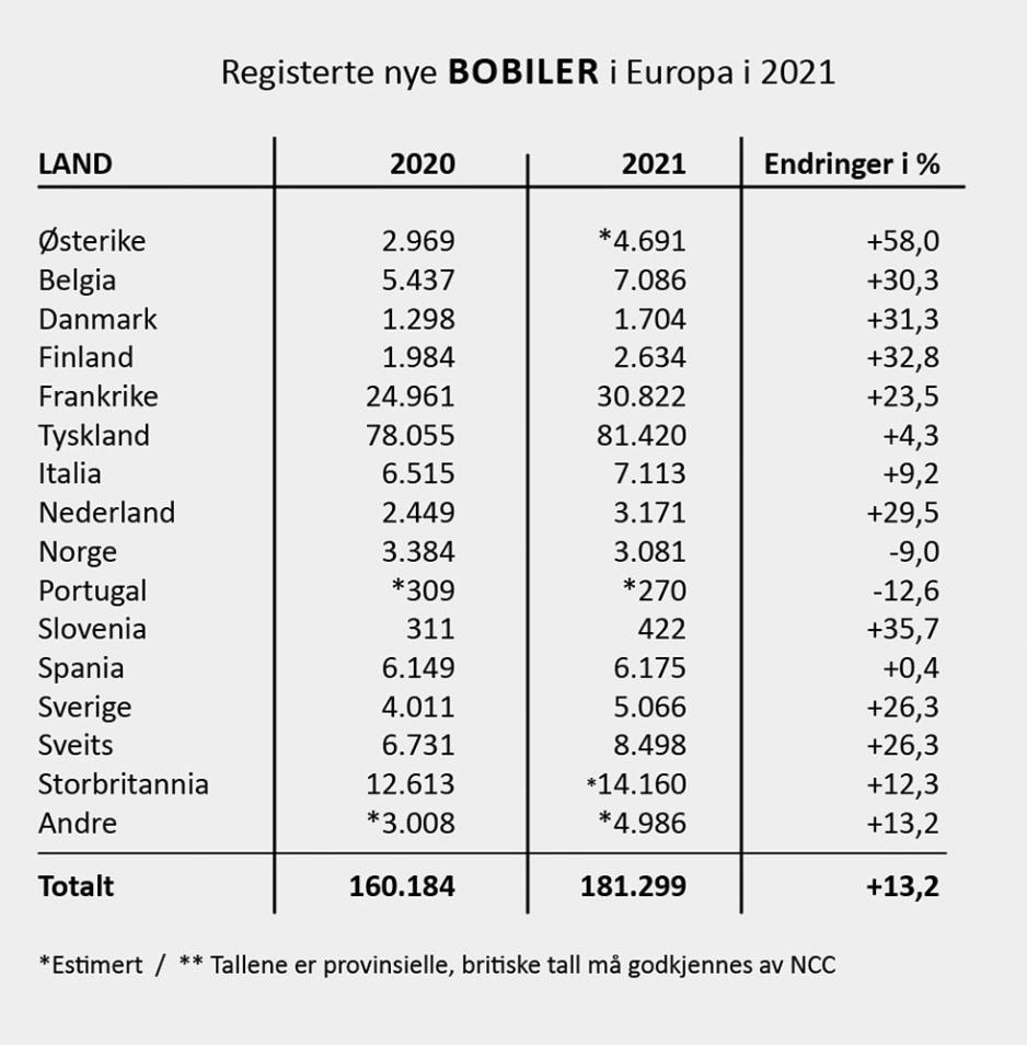 Østerrike hatt en kjempeøkning når det gjelder nyregistrerte bobiler, den er på hele 58 prosent. Bobilsalget i Sverige har hatt en turbulent periode, med innføring av en ny luksusskatt. Nå ser det ut til å roe seg, og over 5000 nye bobiler solgt i 2021 er gode tall og en vekst på 25 prosent.