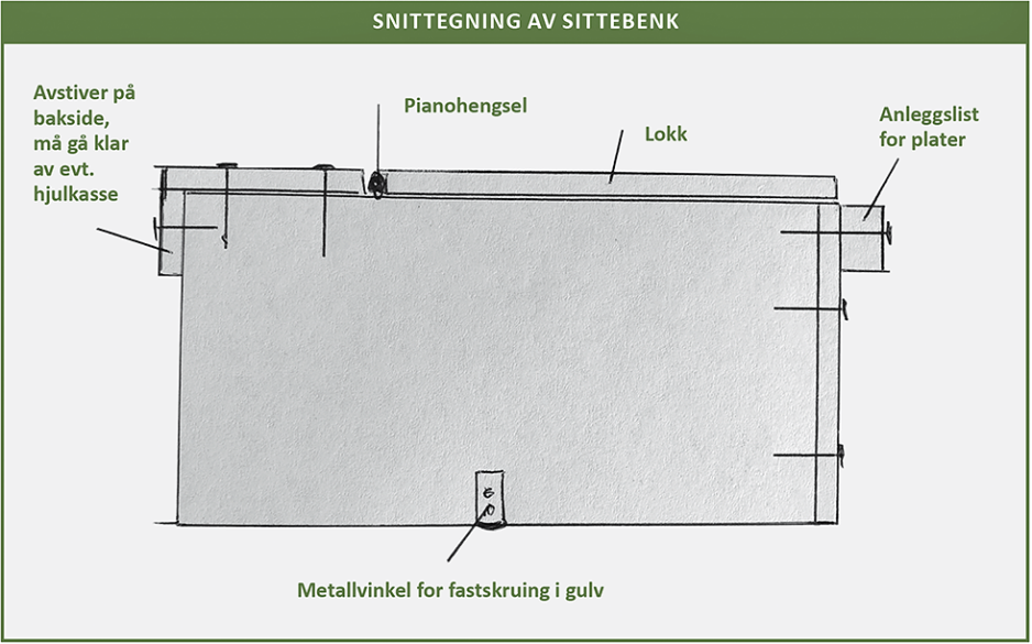 De «profesjonelle» innredningene er laget for eksempel i 15 mm poppelfiner. Det er en lett finer, men også furu gjør nytten. Overflaten kan males, lakkes eller tapetseres. Platene skrus sammen med treskruer med forsenket hode (Spax) med målene 4x25 og 4x40 mm. Benkene lages i ett stykke med to endevegger og to skillevegger, men uten bunn. Listverk til møbler, bordunderstell og så videre finnes på markedet. Firmaet Reimo er Tysklands største på selvbyggerutstyr (reimo.com) og har et enormt utvalg. I hver ende av benkene lages en fast platebit i forlengelse av lokkene (2 stk på hver benk).