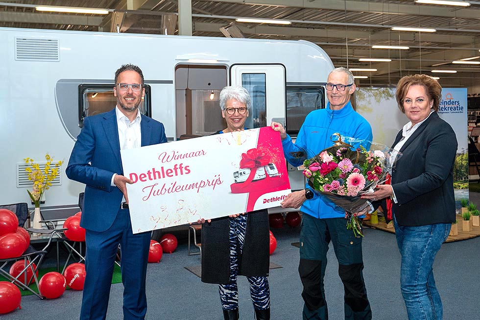 Familien Szarzec kjøpte en Dethleffs Aero 500 familiecampingvogn i jubileumsåret 2021. Dethleffs-forhandler Reinders Rekreatie i Hoogeveen, sammen med Bart Haarman og Annette Kruythoff fra Dethleffs Nederland, overrakte nylig en symbolsk sjekk til Szarzec-familien.