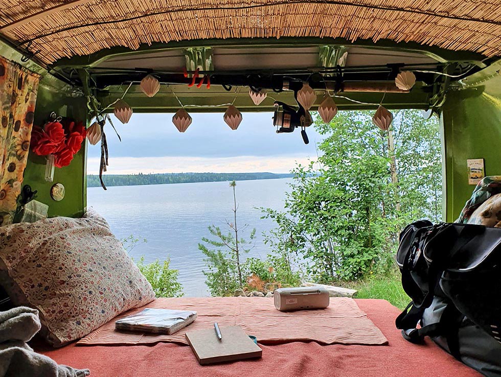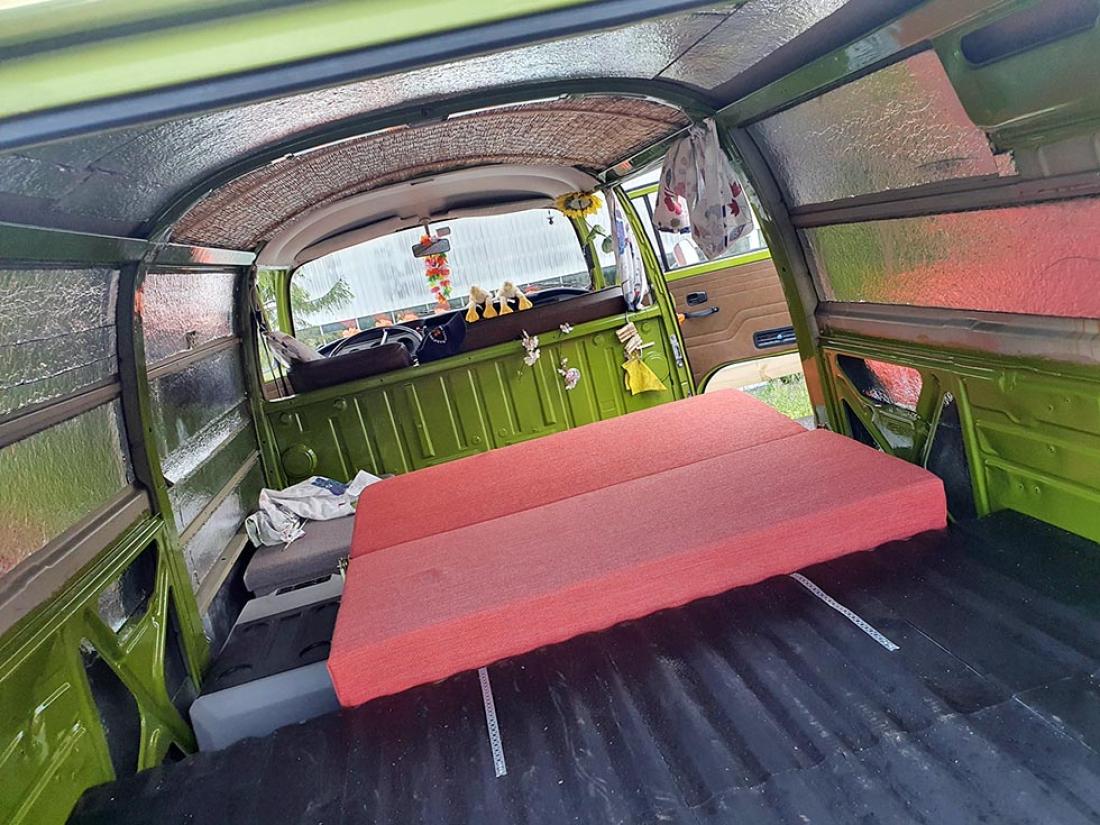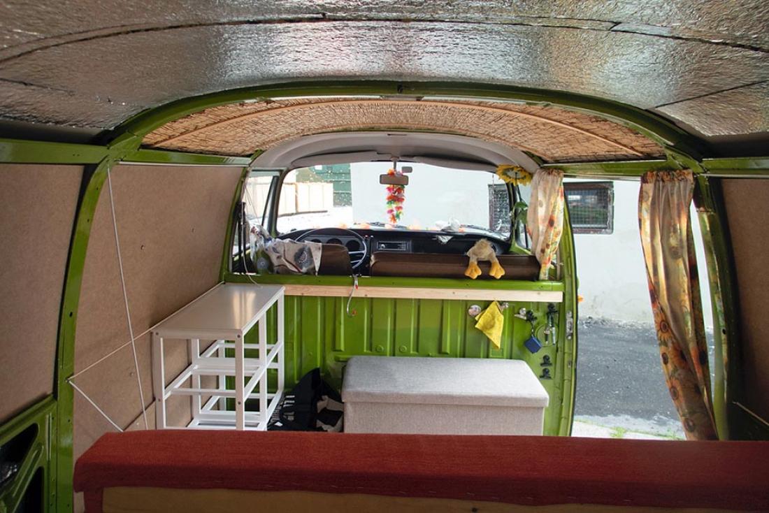 – Jeg svevde på en rosa sky etter at folkevognbussen Olivia hadde blitt min. En måned etter kjøpet var drømmebilen og jeg på vei mot nord. Nye sko, altså dekk, og blomstrete gardiner var den eneste synlige forandringen. Jeg var i lykkerus og tenkte ikke så mye over interiøret, som slett ikke var særlig praktisk. To stooore og tunge sortmalte oppbevaringsbokser med en klaff mellom gjorde det mulig å sove i bilen. Vegger og tak var umalte og grå. Nå var tiden moden for en oppussing!