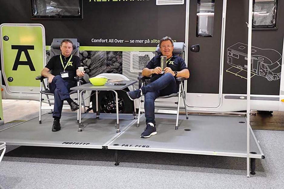 Mange bobileiere har tepper eller presenning foran inngangspartiet. Men hvorfor nøye seg med det, når man kan ha med seg sitt eget terrassegulv, tenkte de to norske gründerne, og begynte utviklingen av Allterrain.