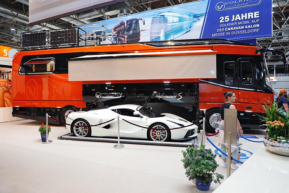 Selvsagt skal en bil ha garasje, tenker du kanskje. Det syntes åpenbart mange av utstillerne av store linere under Caravan Salon-messen i august. I hall 5 var det nemlig en overflod av stooore bobiler med plass til en ekstra personbil ombord.
