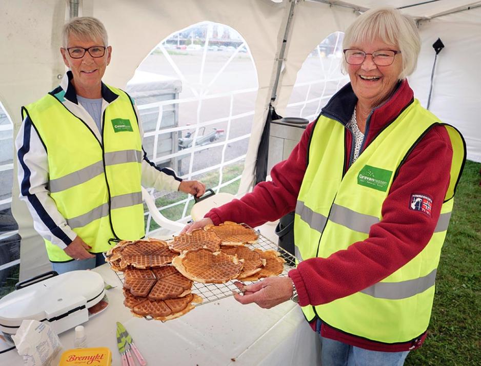 I teltet ved innkjøringen til messecampen finner vi Marit Fossum og Mette Kjellgård i full gang med vaffelsteking, pølsekoking og ikke minst kaffetrakting.