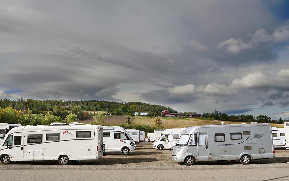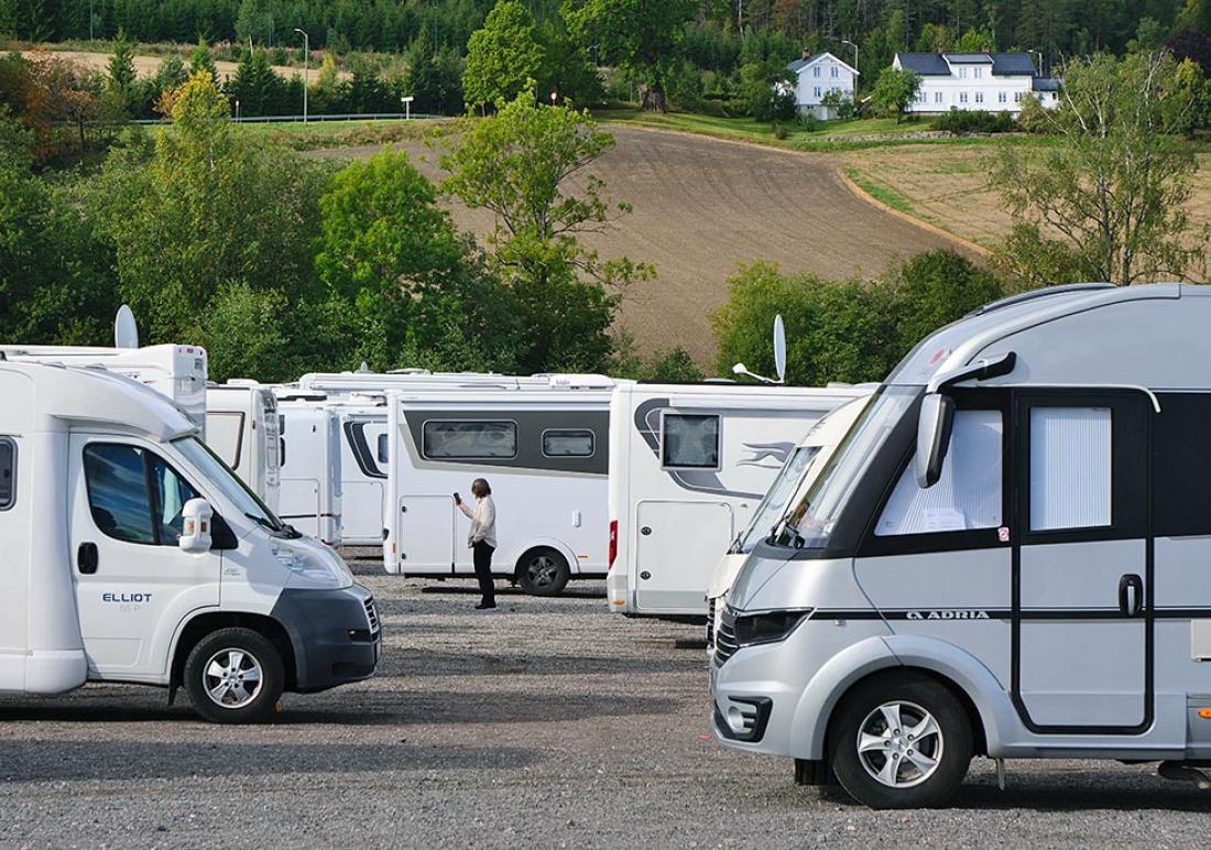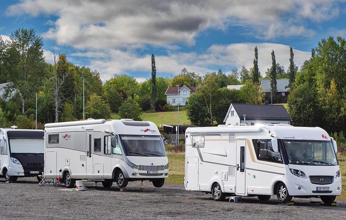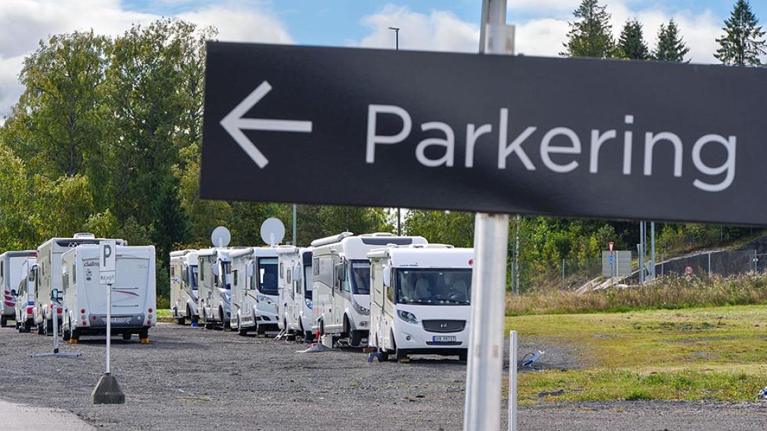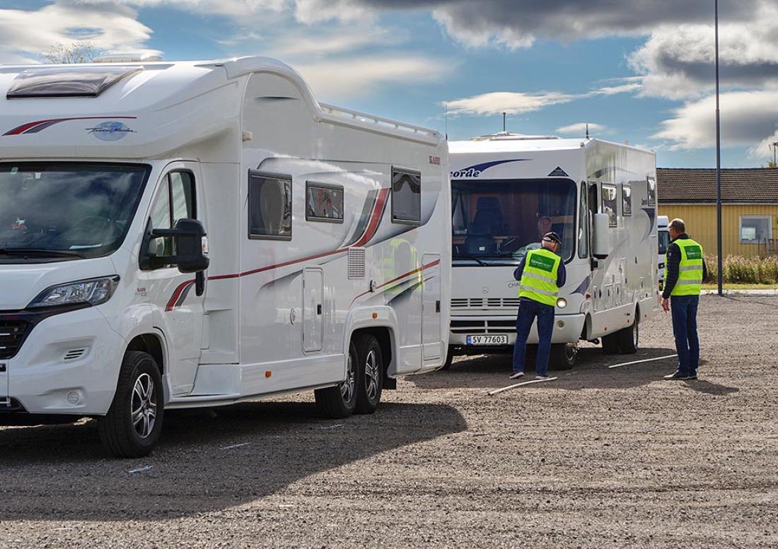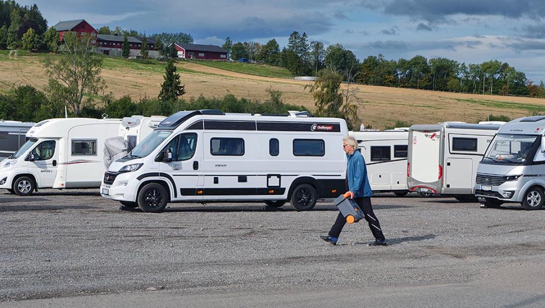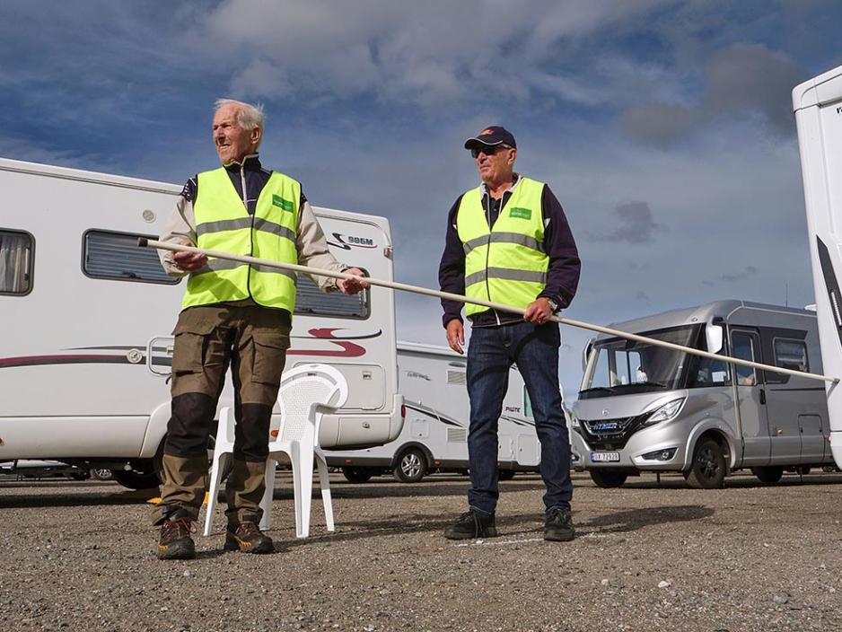 På messecampområdet finner vi Kjell Fossum og Egil Slemdal med lange stokker. De vinker de nye bobilgjestene på plass. Firemeters-regelen gjelder, og selvsagt er det branngate mellom rekken av bobiler og vogner. Her følges alle avstandsregler på centimeteren.