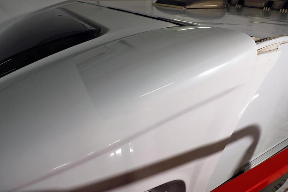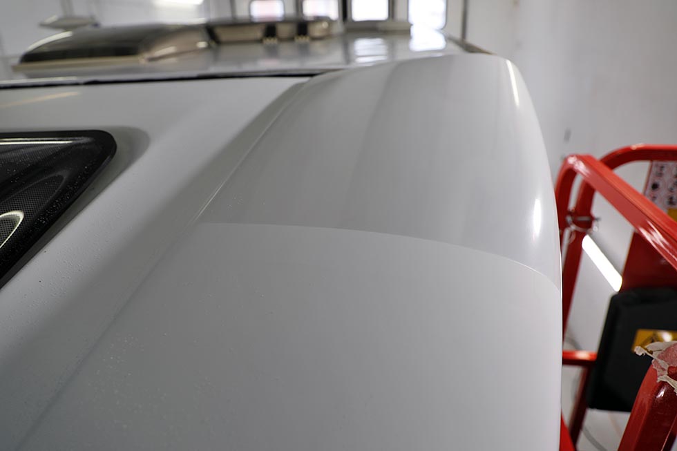 Neste område er frontrute og overbygget over fører. Dette er spesielt utsatte områder. Det skyldes ikke minst solas UV-stråler. Når jeg tar på overflaten på den plastlagte glassfiberen over førerhodet, føles det nesten som et 60-pussepapir. Det er overraskende grovt. Her kjører Christian to steg: Først renser han med et slipemiddel og hard pute på poleringsmaskinen. Det åpner porene i glassfiberen. Så legger han et beskyttelseslag med et egnet middel etterpå. Resultatet blir overveldende bra.