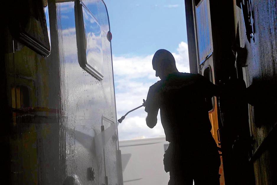 Nyvasket og tørr bobil eller vogn er vårt utgangspunkt. Det er mange fordeler med å stå innendørs. Det har dessverre ikke alle mulighet til. Står du utendørs er det viktig å unngå sollys. Det gjelder både når man vasker og polerer, forteller Christian. På hans arbeidsplass er vaskeplassen og poleringsplassen i to ulike haller.