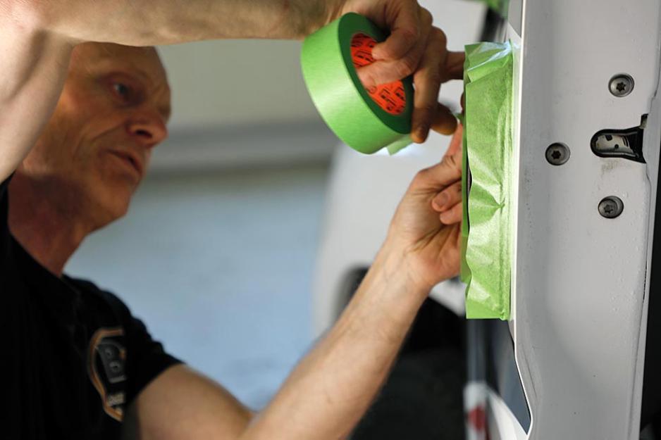Før polering er et smart tips å bruke maskeringsteip på plastdetaljene. De vil ellers få varige merker av poleringsmiddel eller lakkrensemiddel, forteller vår ekspert. Han teiper plastlisten rundt vinduene, dørhåndtaket og overgangen til plastdetaljer i grillen.