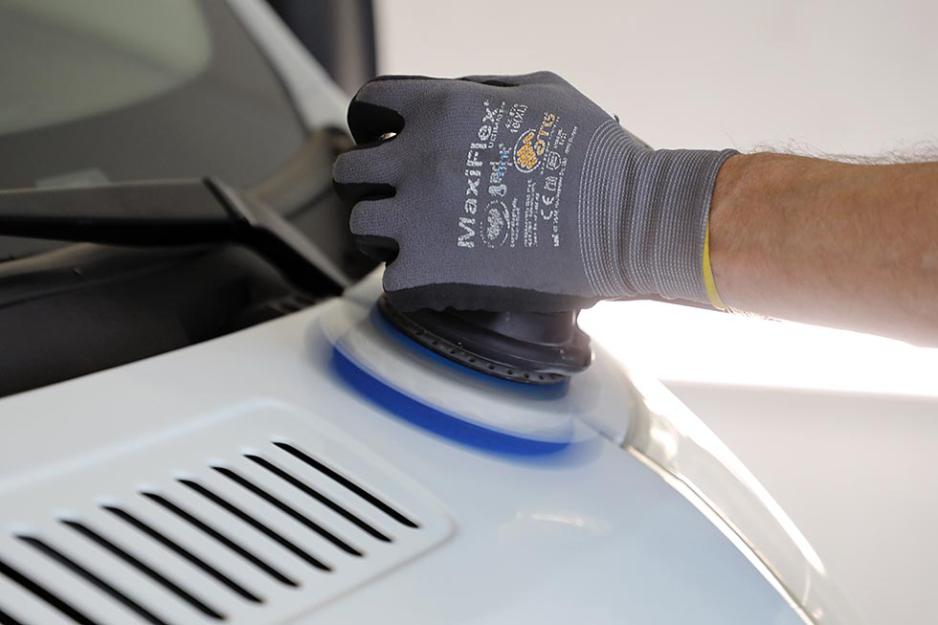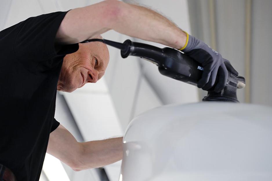 Neste trinn er selve poleringen. Christian har to poleringsmaskiner, en i 5" størrelse for normale flater, og en mindre på 3". Den siste er for områder med buede profiler. Her vil en større maskin kunne gi et for ujevnt resultat, på den måten at den tar for hardt på kanten og ikke kommer til på andre områder.