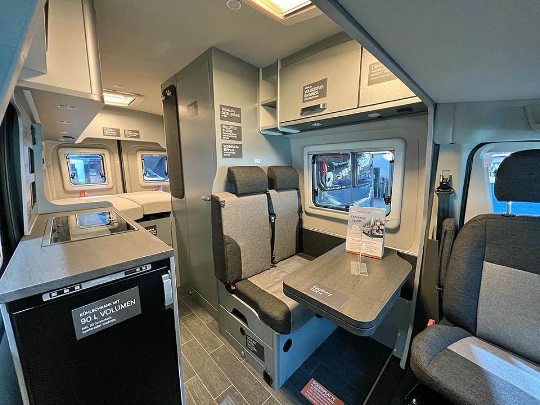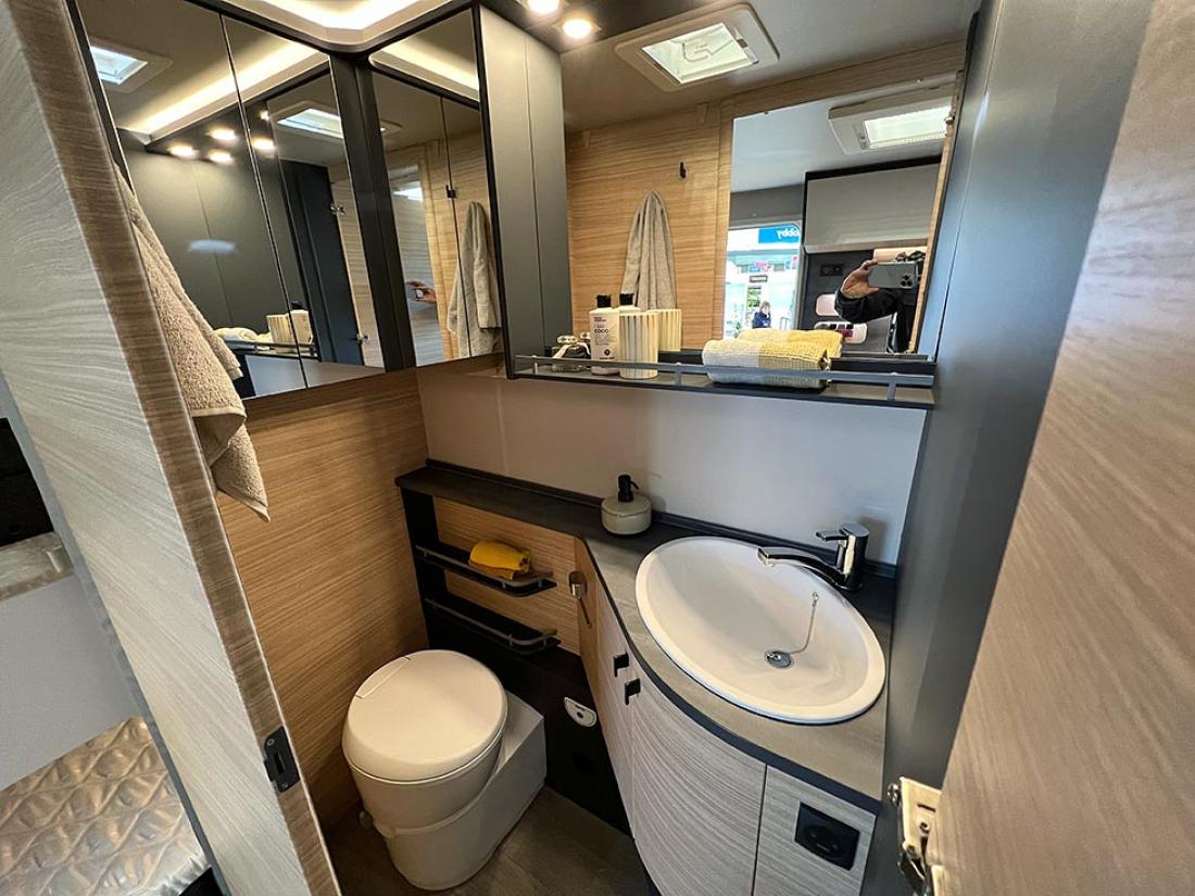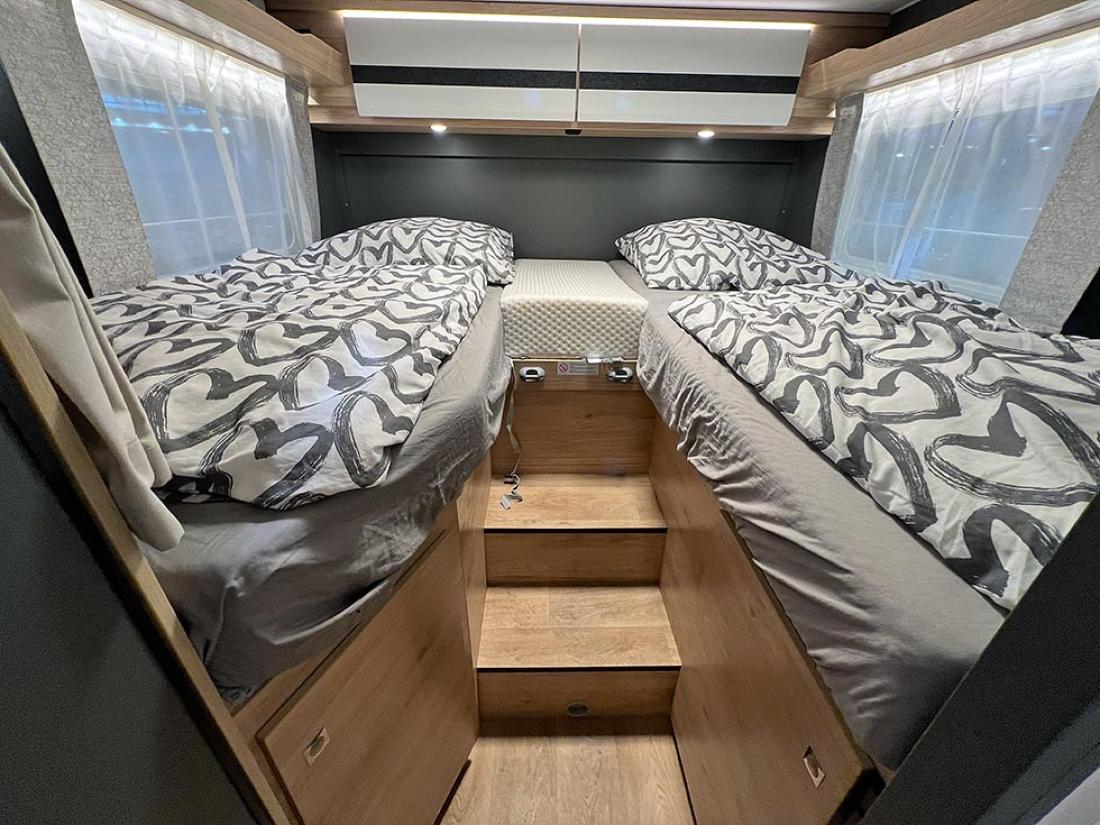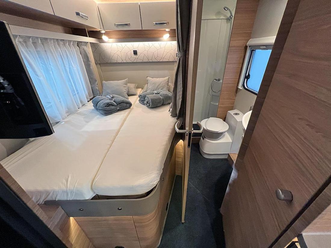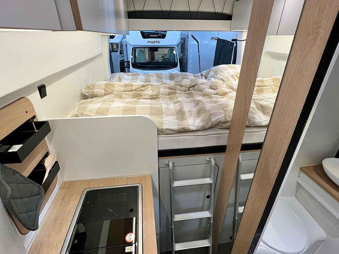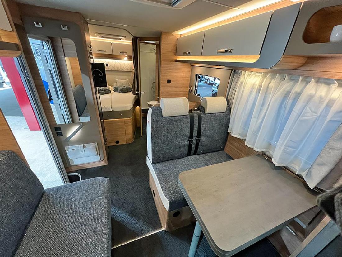 Det å ha hovedsengen og badet parallelt var tidligere en populær interiørløsning på bobiler. Det er en plasseffektiv løsning, selv om sengen har en tendens til å bli smal. På messen viste Dethleffs fram en ny modell med nettopp fransk sengeløsning i den Ford-baserte serien Just Go. Modellen T 6905 FB kan i tillegg utstyres med senkeseng. Den 699 cm lange bobilen oppleves som luftig innvendig. Det skyldes nok interiørløsningen, takhøyden på 213 cm og at den er i «full bredde» med sine 233 cm. Vi testet enkeltsengmodellen Dethleffs Just Go T 7055 EB i forrige utgave.