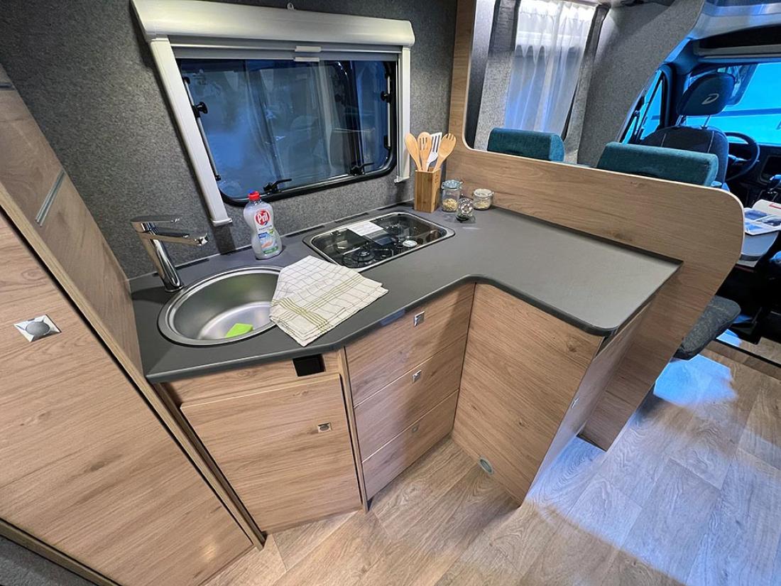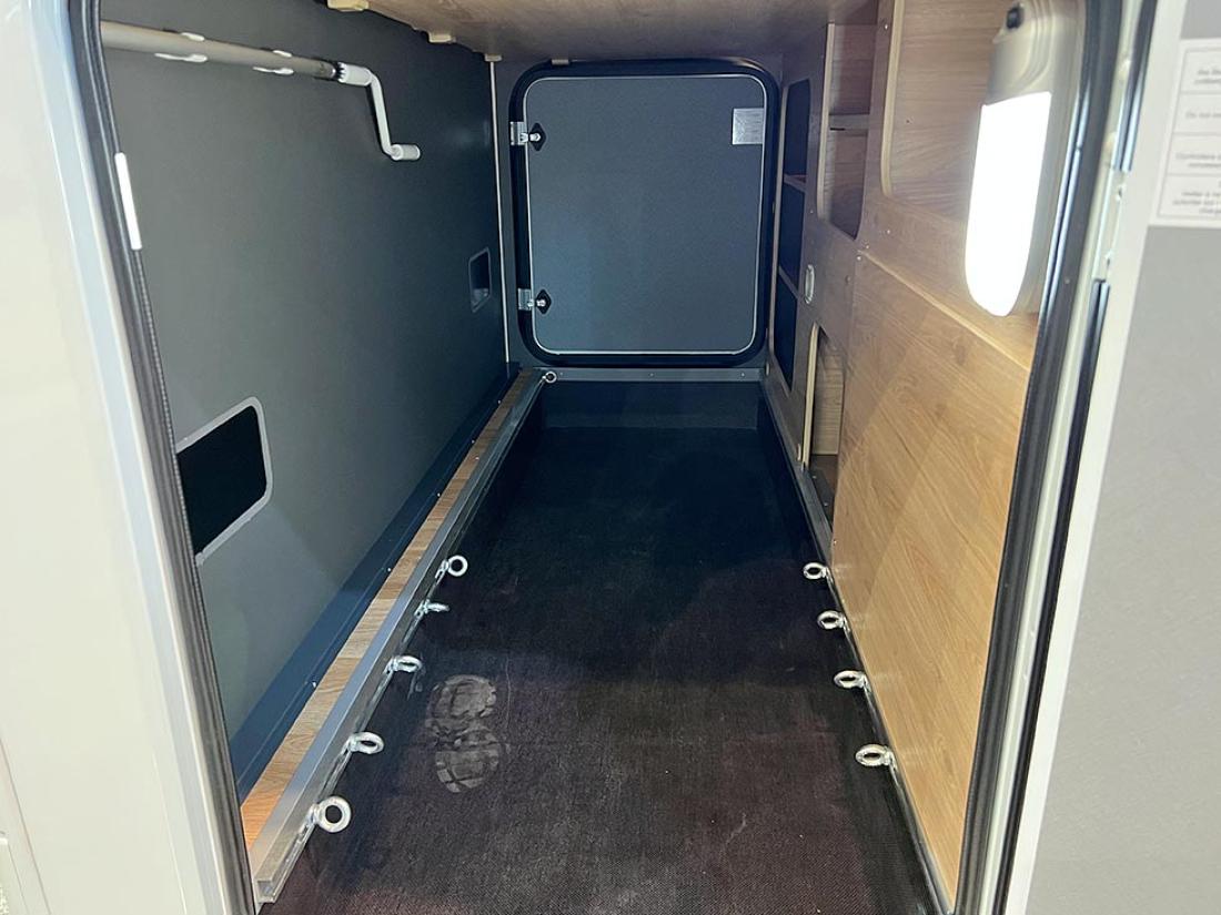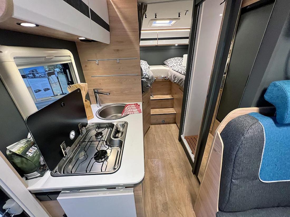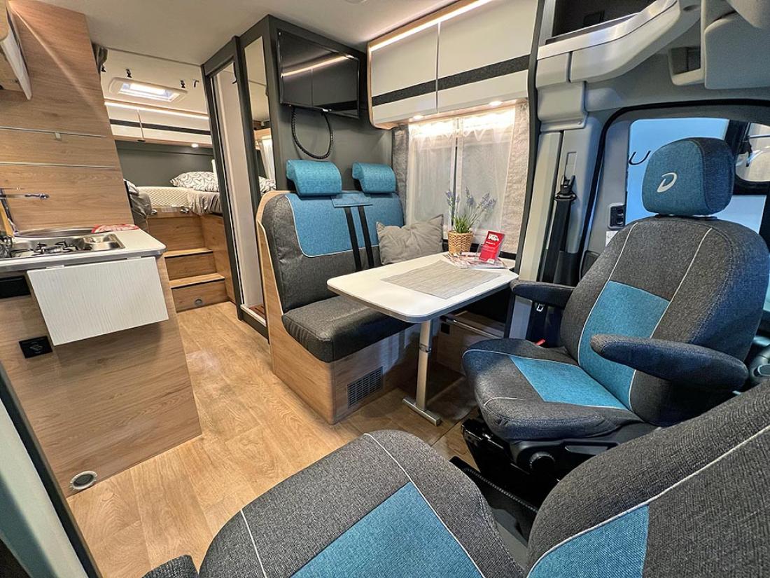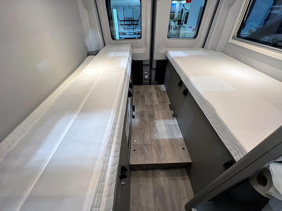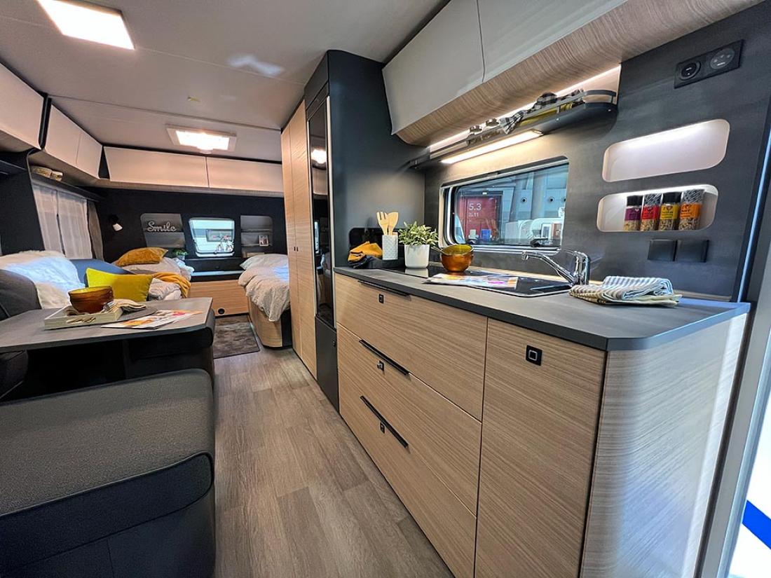 Det å ha hovedsengen og badet parallelt var tidligere en populær interiørløsning på bobiler. Det er en plasseffektiv løsning, selv om sengen har en tendens til å bli smal. På messen viste Dethleffs fram en ny modell med nettopp fransk sengeløsning i den Ford-baserte serien Just Go. Modellen T 6905 FB kan i tillegg utstyres med senkeseng. Den 699 cm lange bobilen oppleves som luftig innvendig. Det skyldes nok interiørløsningen, takhøyden på 213 cm og at den er i «full bredde» med sine 233 cm. Vi testet enkeltsengmodellen Dethleffs Just Go T 7055 EB i forrige utgave.