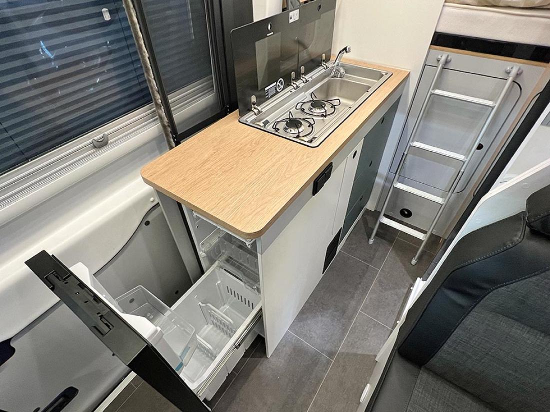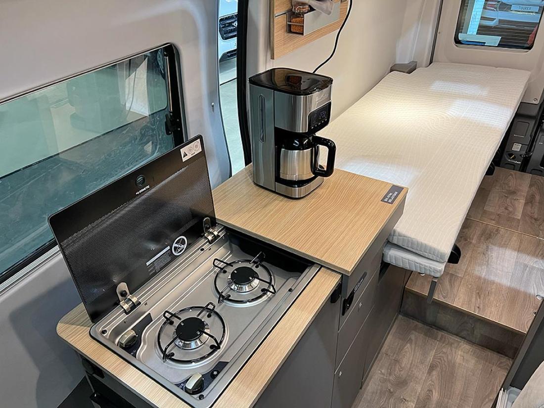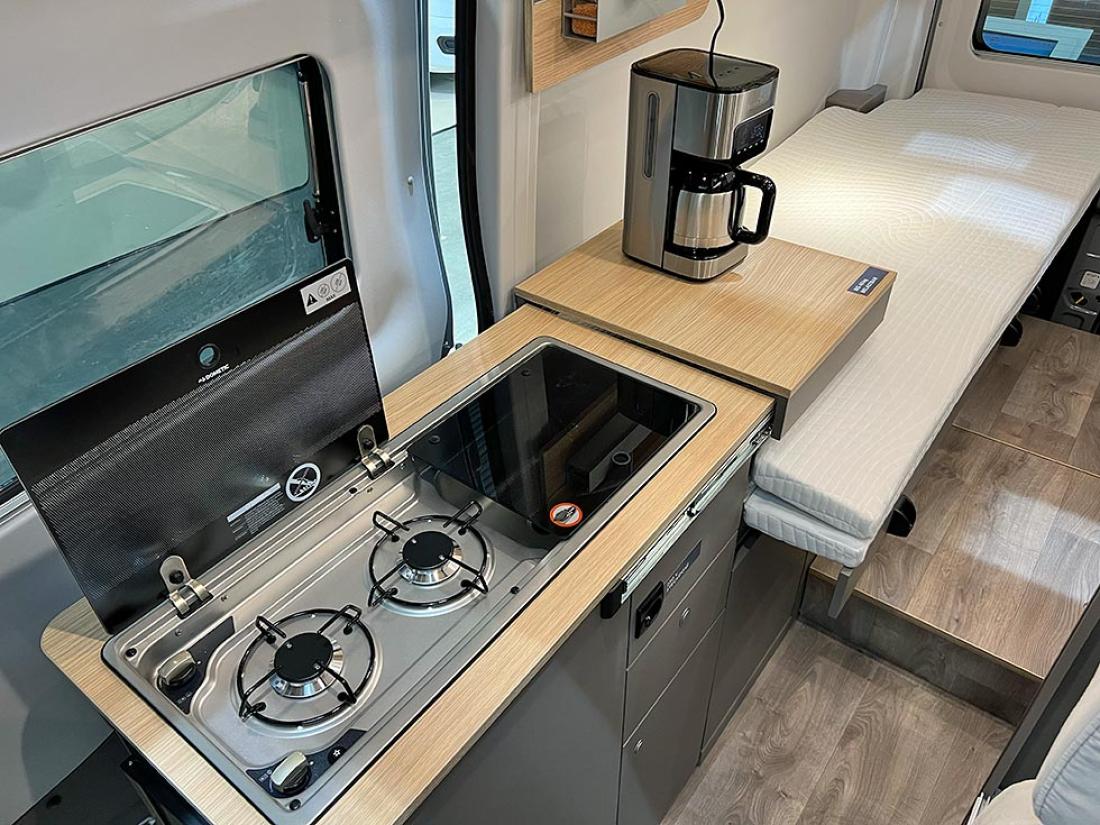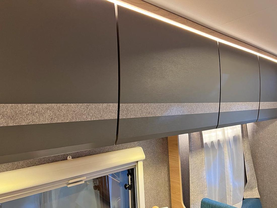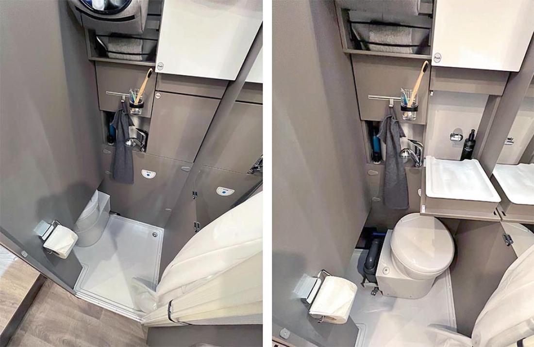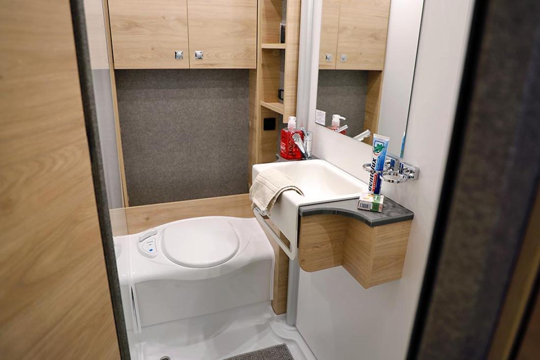 Det å ha hovedsengen og badet parallelt var tidligere en populær interiørløsning på bobiler. Det er en plasseffektiv løsning, selv om sengen har en tendens til å bli smal. På messen viste Dethleffs fram en ny modell med nettopp fransk sengeløsning i den Ford-baserte serien Just Go. Modellen T 6905 FB kan i tillegg utstyres med senkeseng. Den 699 cm lange bobilen oppleves som luftig innvendig. Det skyldes nok interiørløsningen, takhøyden på 213 cm og at den er i «full bredde» med sine 233 cm. Vi testet enkeltsengmodellen Dethleffs Just Go T 7055 EB i forrige utgave.