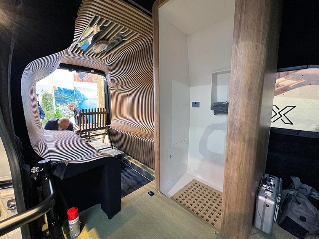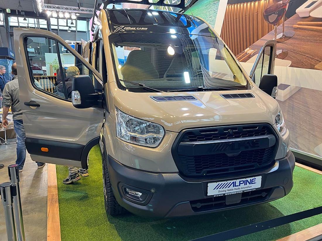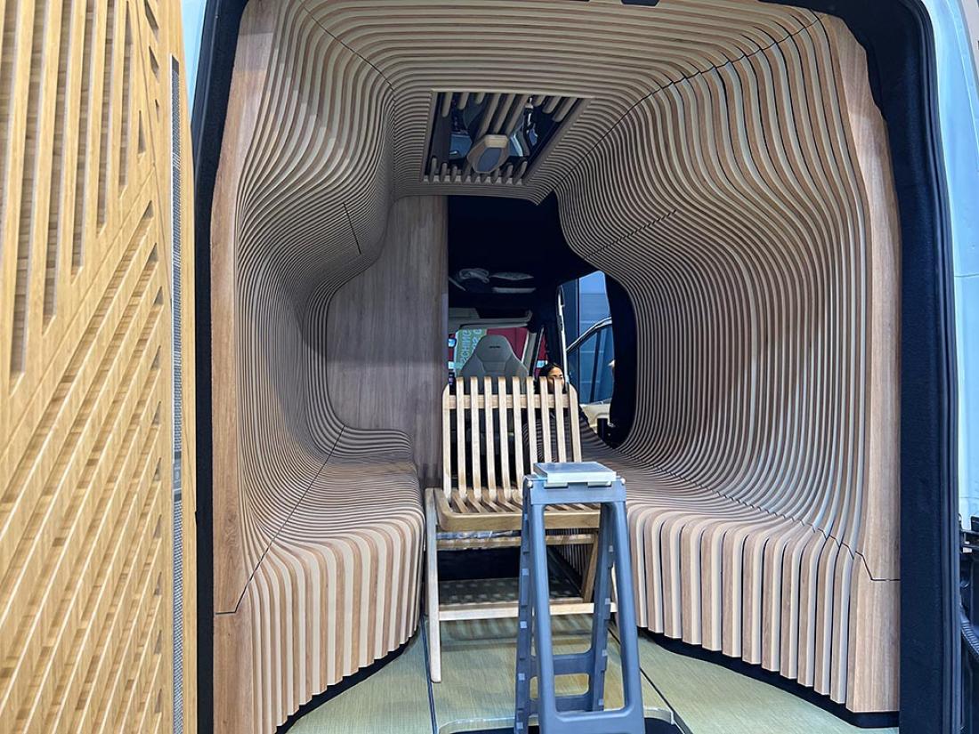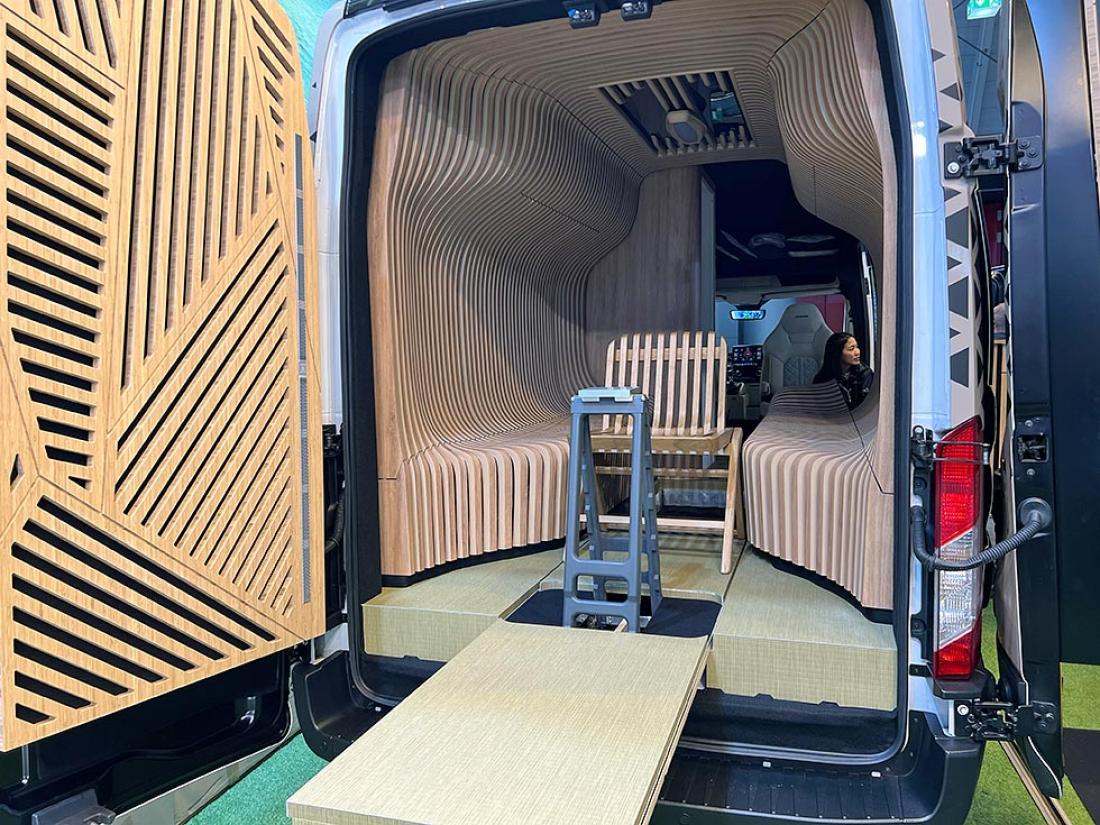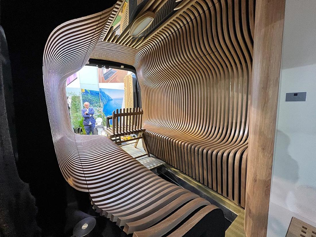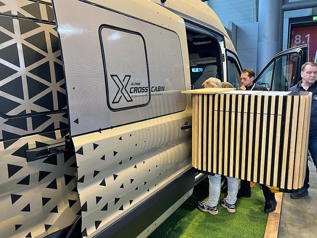 Er det messe skal det høres og synes, tenkte nok lydanlegg-produsenten Alpine. De har fått spesialinnredet en bybobil med en innvendig trekonstruksjon, som vi tipper er mer imponerende enn nyttig i en praktisk bobilhverdag.