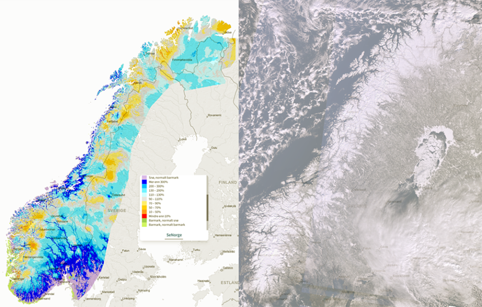 Målestasjonene til NVE og snøkartene i SeNorge viser at det er mer snø enn normalt på store deler av Østlandet og i deler av Nordvestlandet og Trøndelag.