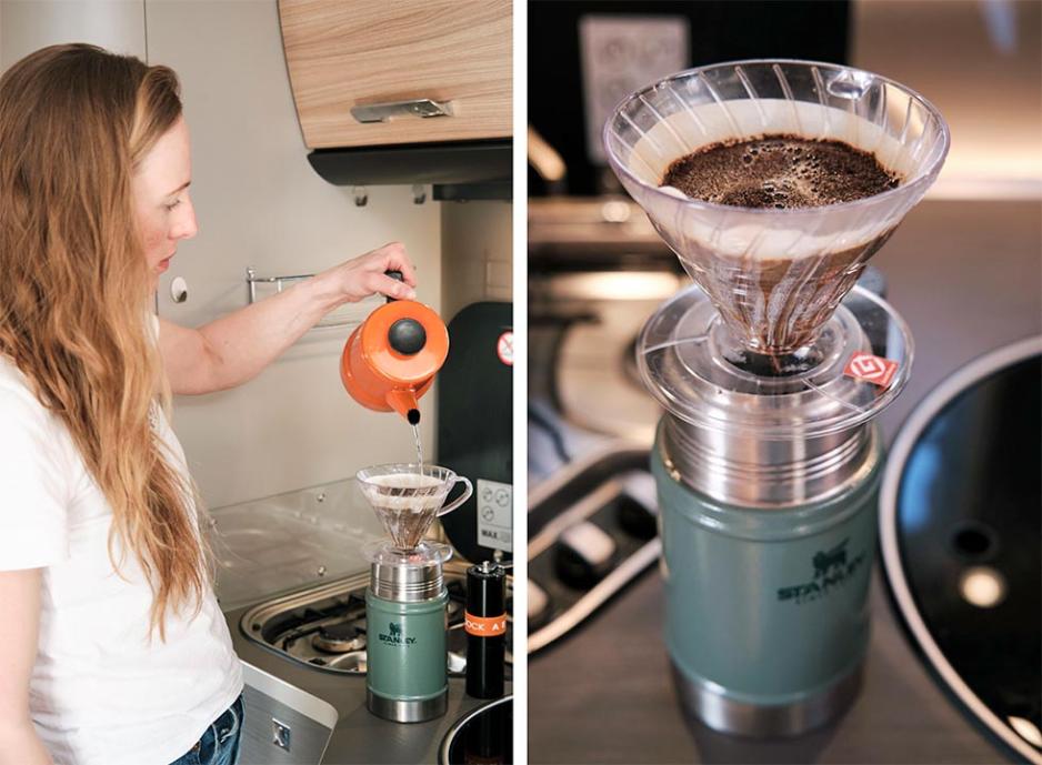 På tur kan du håndbrygge ved å plassere en filterholder rett på en termos eller kopp. Med filter og kaffe på plass, heller du så på kokt vann.