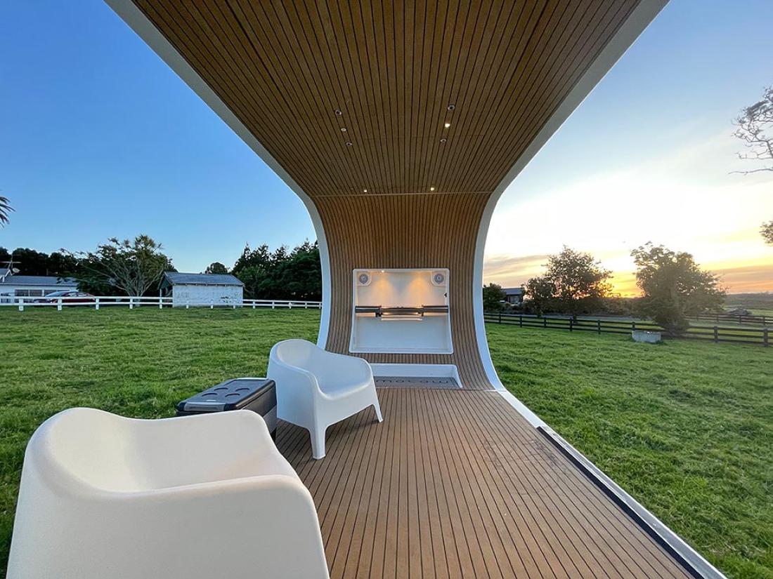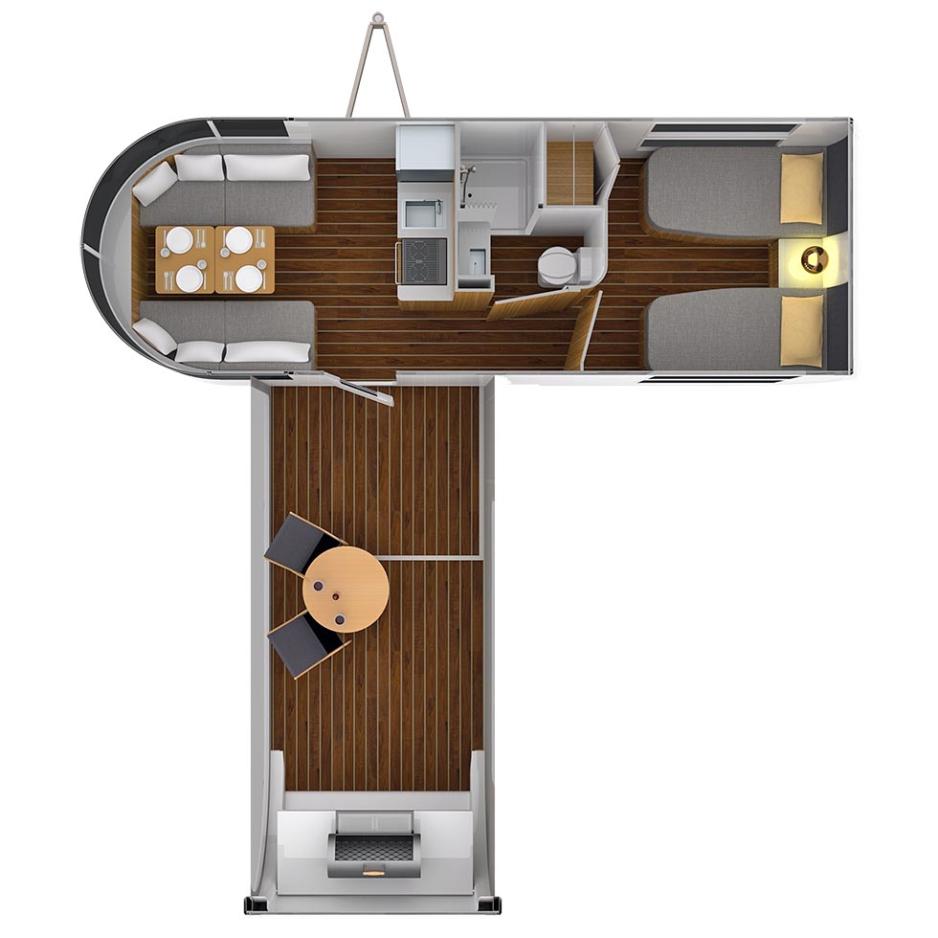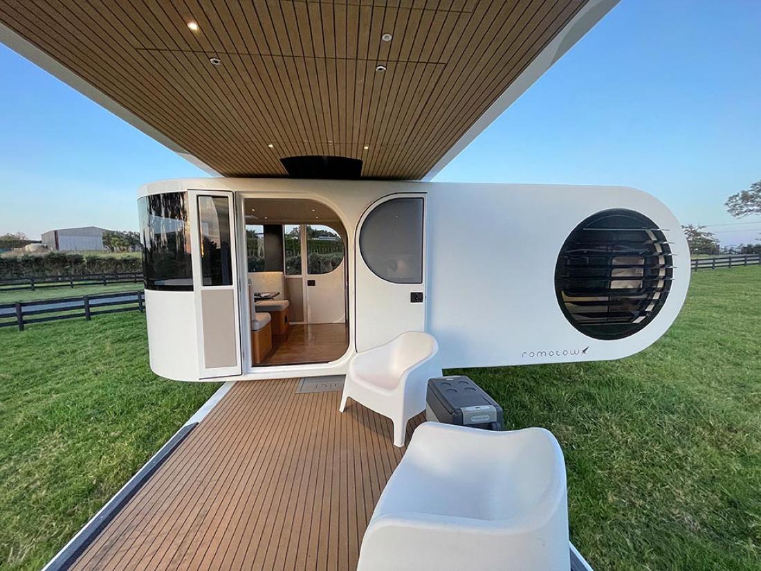 Romotows konstruksjon er derimot høyst moderne, og har tatt idéen om å lage ekstra plass når du har parkert et stort skritt lenger. For når støttebena er nede på denne vogna kan du ved å trykke på en knapp folde ut innmaten i denne kreasjonen av en campingvogn. Resultatet er at du får nesten 27 kvm med vogn og uteplass i en 90-graders konstruksjon. Det blir nesten som et lite tun.