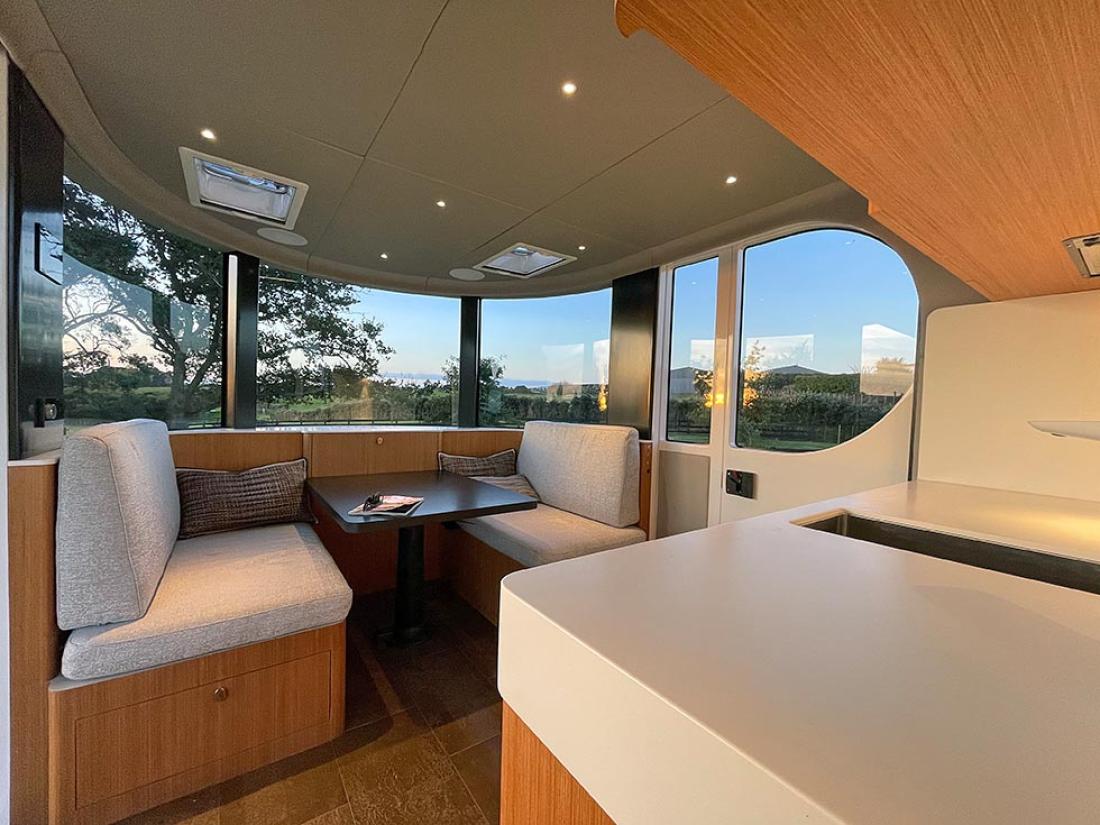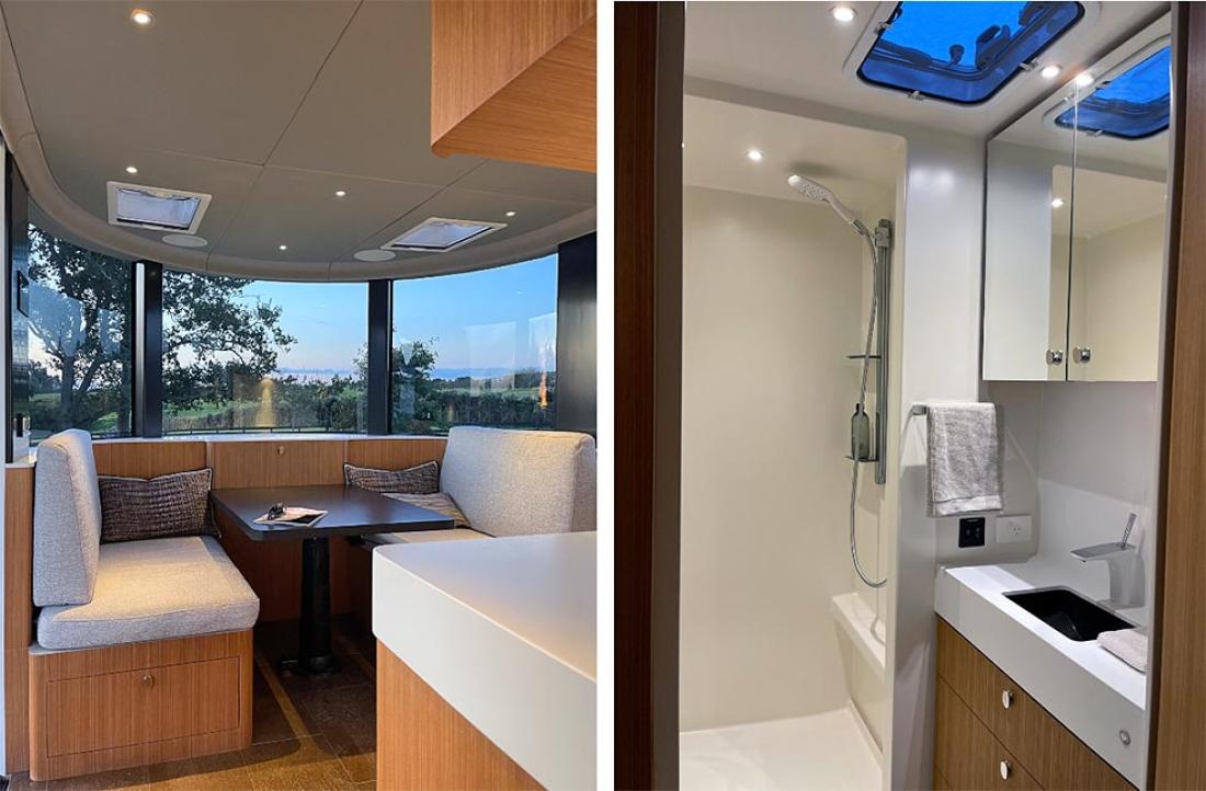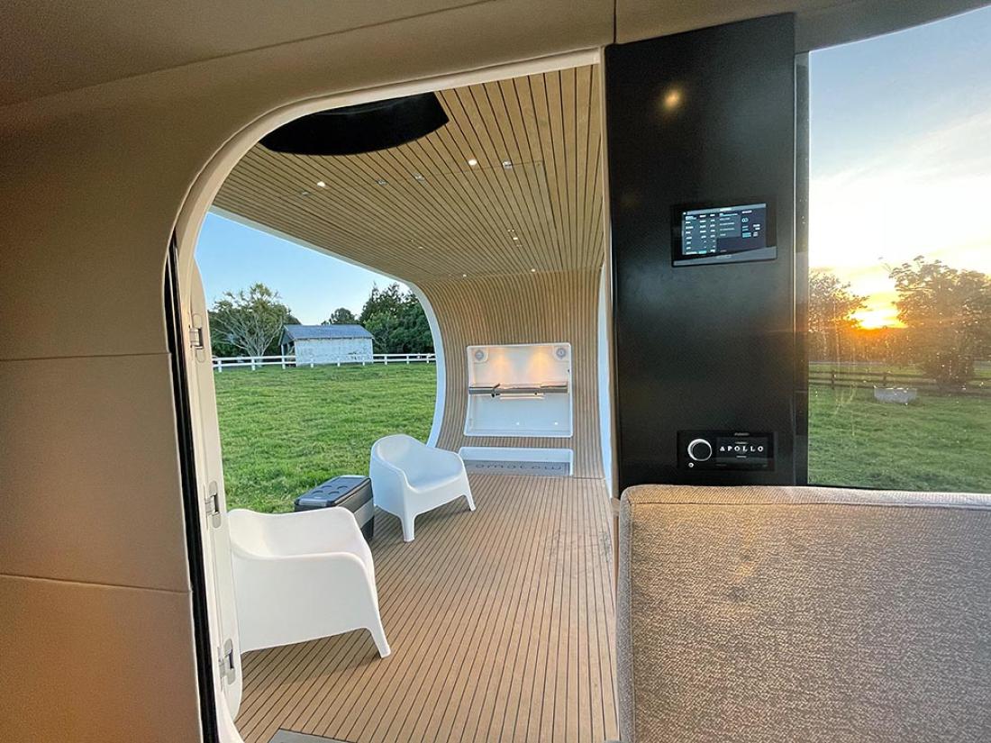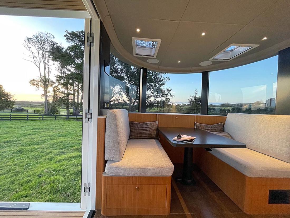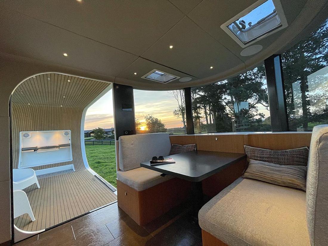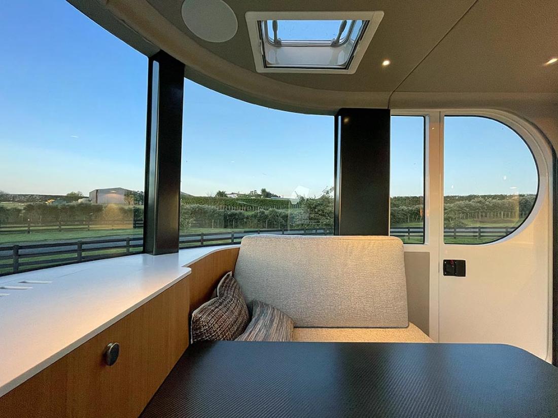 Nå settes vogna i produksjon, og det er mulig å bestille seg et eksemplar. Vi har testet ut bestillingsskjemaet, og du kan velge mellom dobbeltseng eller enkeltsenger. Men det er langt flere valg også, for eksempel om du vil ha doble vinduer, om du vil ha en skylight takluke over salongen, du kan få markise, sammenleggbar sittegruppe som kan plasseres om bord når du kjører, du kan få en såkalt premium finish, elektrisk betjent senkeseng, teppe, 32" nedsenkbar TV, ekstra TV på soverommet, oppgradert multisoners lydanlegg, ryggekamera, wifi-ruter, utvendig projektorskjerm og bærbar projektor, luftfjæring, aircondition, ekstra litiumbatterier, 230 V-inverter, solcellepanel. Taket er i syntetisk teak, og de buede panoramavinduene i fronten er 6 mm herdet glass.