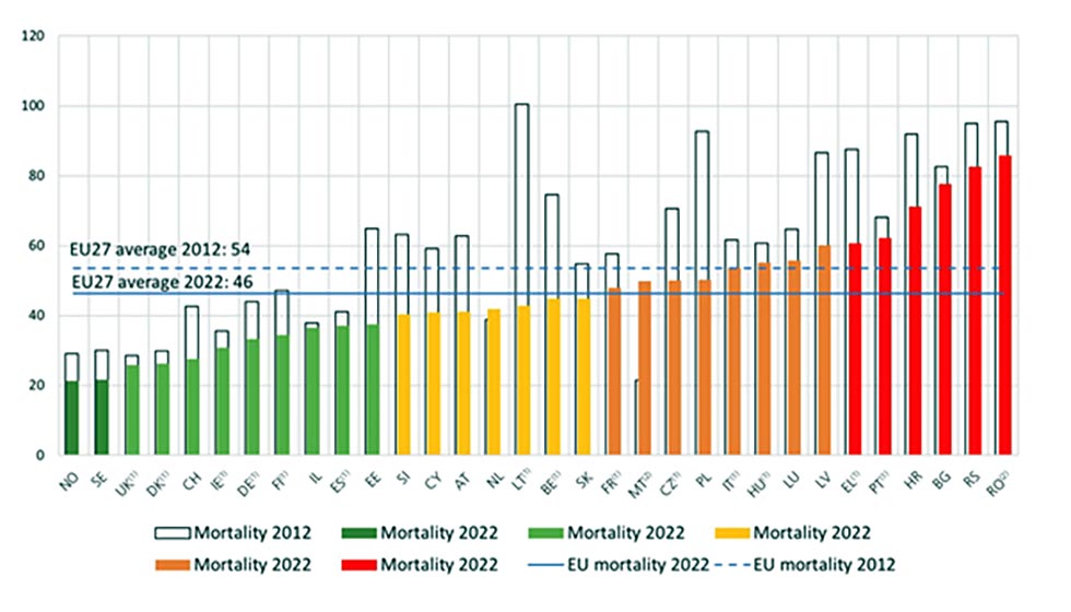 20 678 mennesker mistet livet på europeiske veier i 2022, noe som tilsvarer nesten 400 i uken, og er en økning siden i fjor. I store deler av Europa er det en oppgang i antall omkomne på veiene etter 2020 og 2021. ETSC peker på pandemien og transportrestriksjonene som svaret på dette. Sammenlignes tallene med året før pandemien i 2019, er det en reduksjon i dødstallene på 9 prosent.