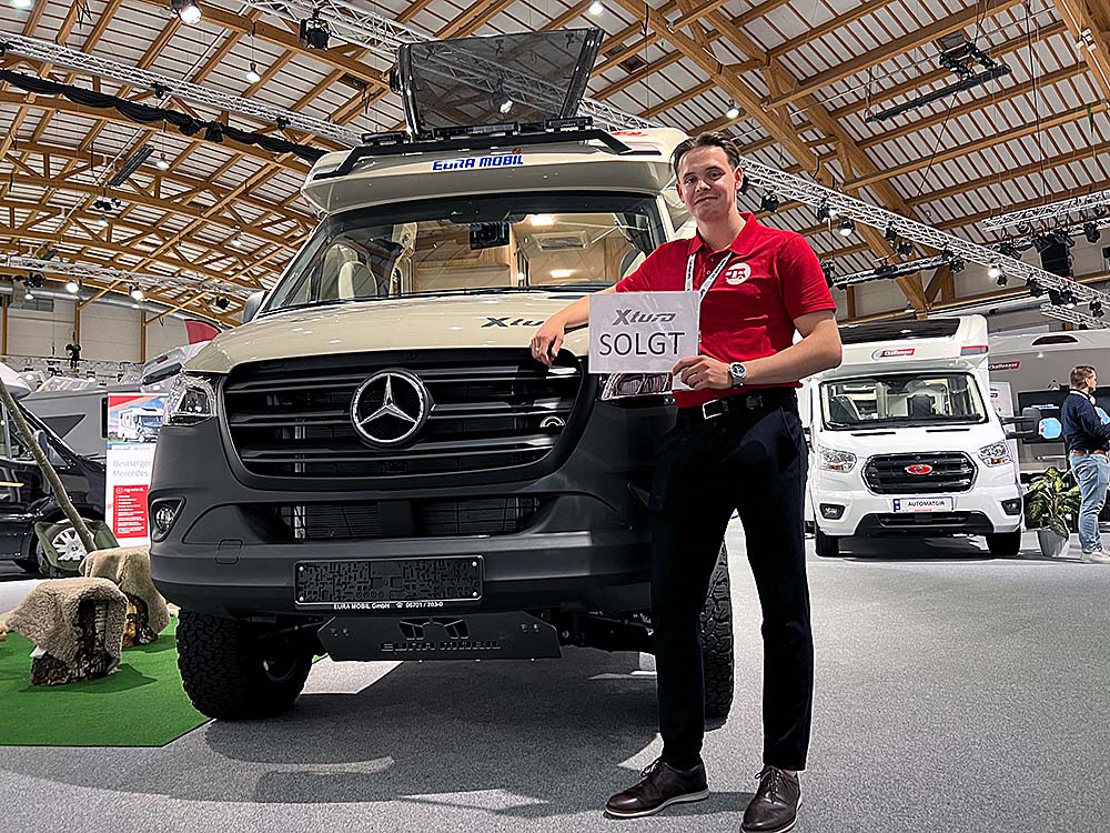 – Jeg har en bakgrunn i bransjen siden min far har etablert og driver Løviknes Caravan i Vestnes, forteller en blid Andreas. Det er med andre ord ikke første gang unggutten har solgt en bobil. Men å selge det første eksemplaret av nyheten Eura Mobil Xtura, som fikk sin verdenspremiere på Hellerudsletta i dag er ikke akkurat hverdagskost. Prisen for firehjulstrekkeren er 2,6 millioner kroner.