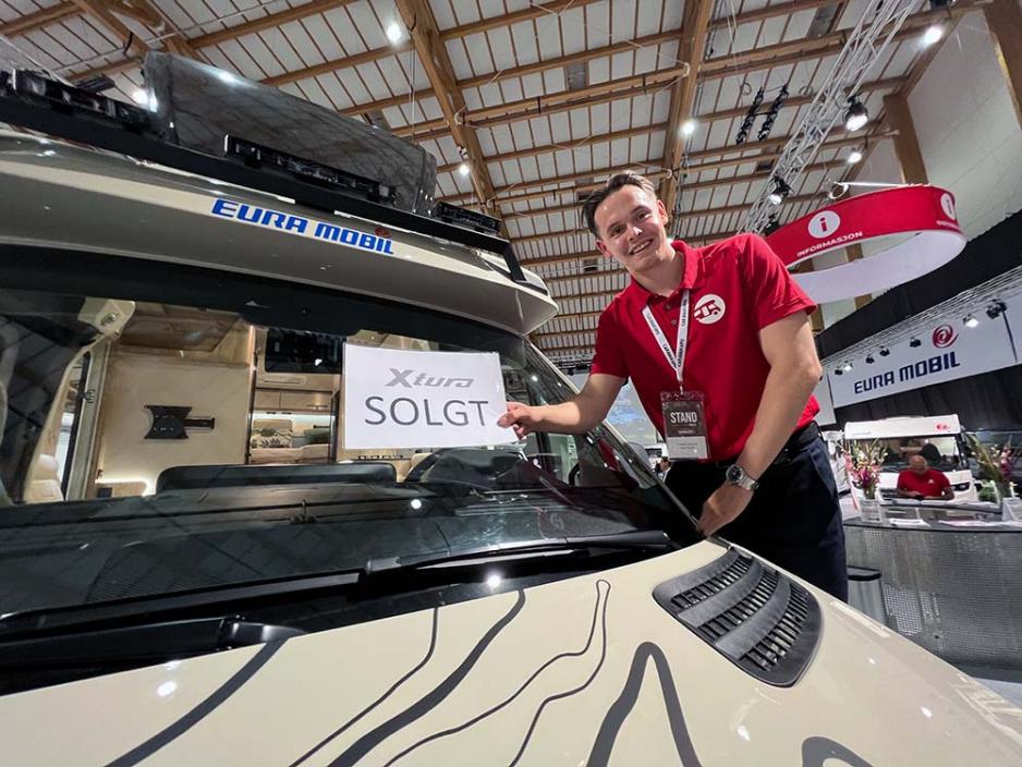 Andreas Løviknes (bildet) solgte i dag verdens første Eura Mobil Xtura. Den 22 år gamle bobilselgeren fra Vestnes jobber på Caravan Xpo-messen for Arve Opsahl-gruppen, og fikk et rekordsalg på messens første dag.
