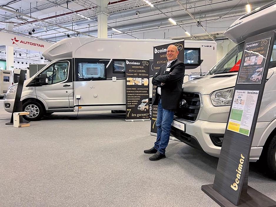 SPESIALMODELLER: Tor Alvern kunne på messen fornøyd avsløre at han har fått produsert to 2024 Benimar-modeller på Ford - spesielt for Norge: Tessoro 481 50-edition er en 5,99 m lang modell med senkeseng, 170 hk og automat, solcelle og ryggekamera til 1 195 000 kr. Tessoro 463 50-edition har to enkeltsenger, solcellepanel og ryggekamera og vil få en pris som ligger 34 000 kr høyere.