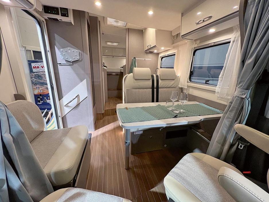 ITALIENSK NYHET: Tellus presenterte tre modeller av merket Etrusco. Blant annet halvintegrerte T 7.3 SF. Dette er en potensiell volummodell på Ford-chassis med automatgir og 7,34 meter lengde. Her er enkeltsenger og senkeseng, og utsalgsprisen ligger på 1 249 900 kr. Modellen T 7400 SB på Fiat er 40 000 kr dyrere med automatgir, men er da også 6 cm lenger. Her finner du også to enkeltsenger og todelt bad. Etrusco er et nytt merke for Norge, som produseres på Laika-fabrikken i Toscana i Italia. Bak satsingen i Norge står forhandlerne Tellus Bergen, Tellus Melhus, Tellus Sunnmøre og Tellus Mohagen.
