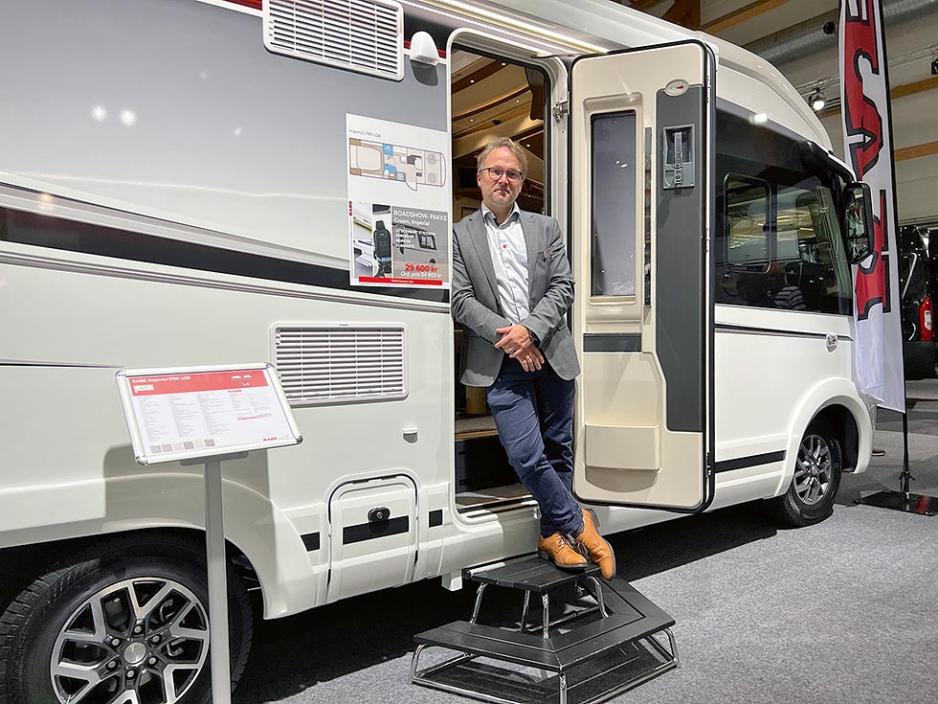 PASSE LANG TOPPMODELL: På messen kunne Kabe presentere den «norske» nyheten Imperial i790 LQB. Modellen til 2 645 000 kr er den minste i Kabes luksuriøse toppserie. At lengden er rett under 8 meter gjør den fergevennlig, noe spesielt norske kunder har etterspurt. Administrerende direktør i Kabe, Mikael Blomqvist, viste stolt fram modellen på messen.