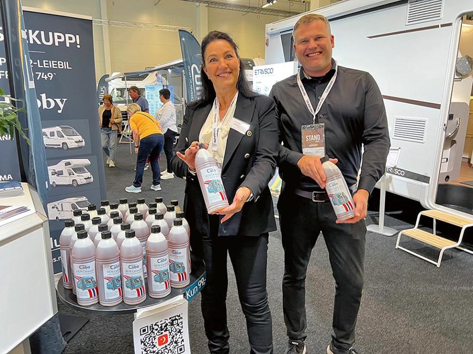 GULLENDE RENT: Tove Ulvatn og Lars Martin Ludvigsen fra Tellus presenterte stolt et nytt norskutviklet og norskprodusert caravan-vaskemiddel. Dette er et alt-i-ett-vaskemiddel, og flere produkter kommer under det nye merkenavnet Cabo, forteller de.