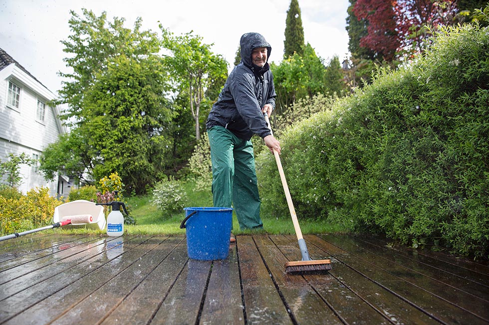 Vedlikeholdsvask av fasade og terrasse er en viktig del av det årlige vedlikeholdet. Det er lurt å starte med fasaden, slik at skitt ikke renner ned på den nyvaskede terrassen.